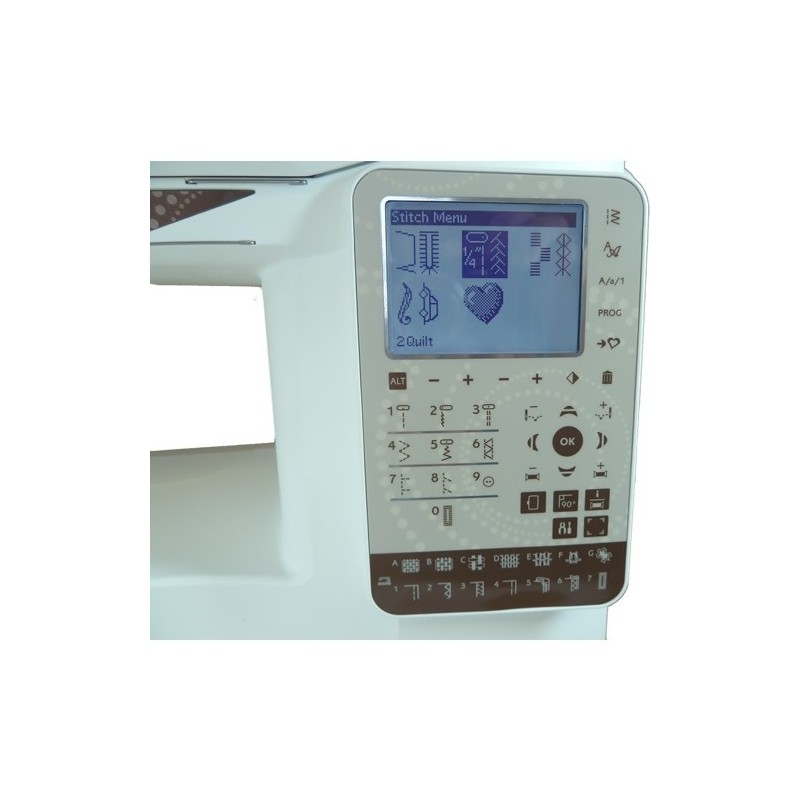 Prosty, zygzak, Multi Zigzag, Blind Hem, Stretch Blind Hem, Rolled Hem, Straight Stretch, Overlock Stretch, Scallop, Ric Rac, plaster miodu, Jodełka, Marszczenie, Aplikacja, Przyszywanie guzików, Ściegi do pikowania, fastrygowanie, Plus wzory dekoracyjne